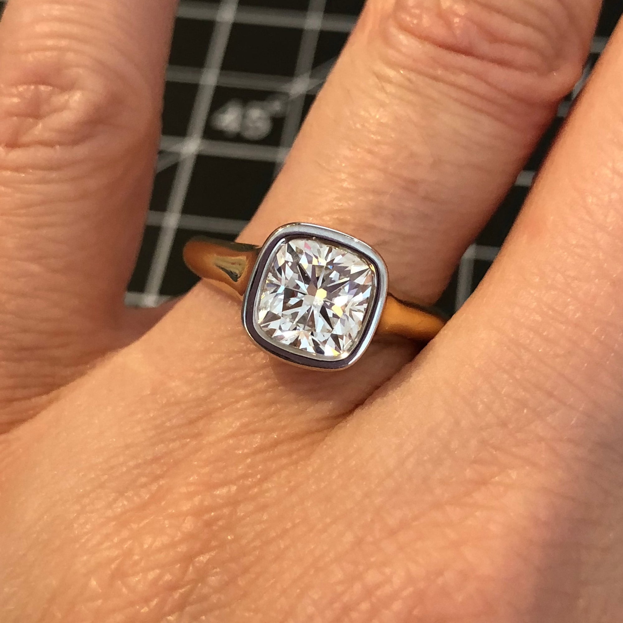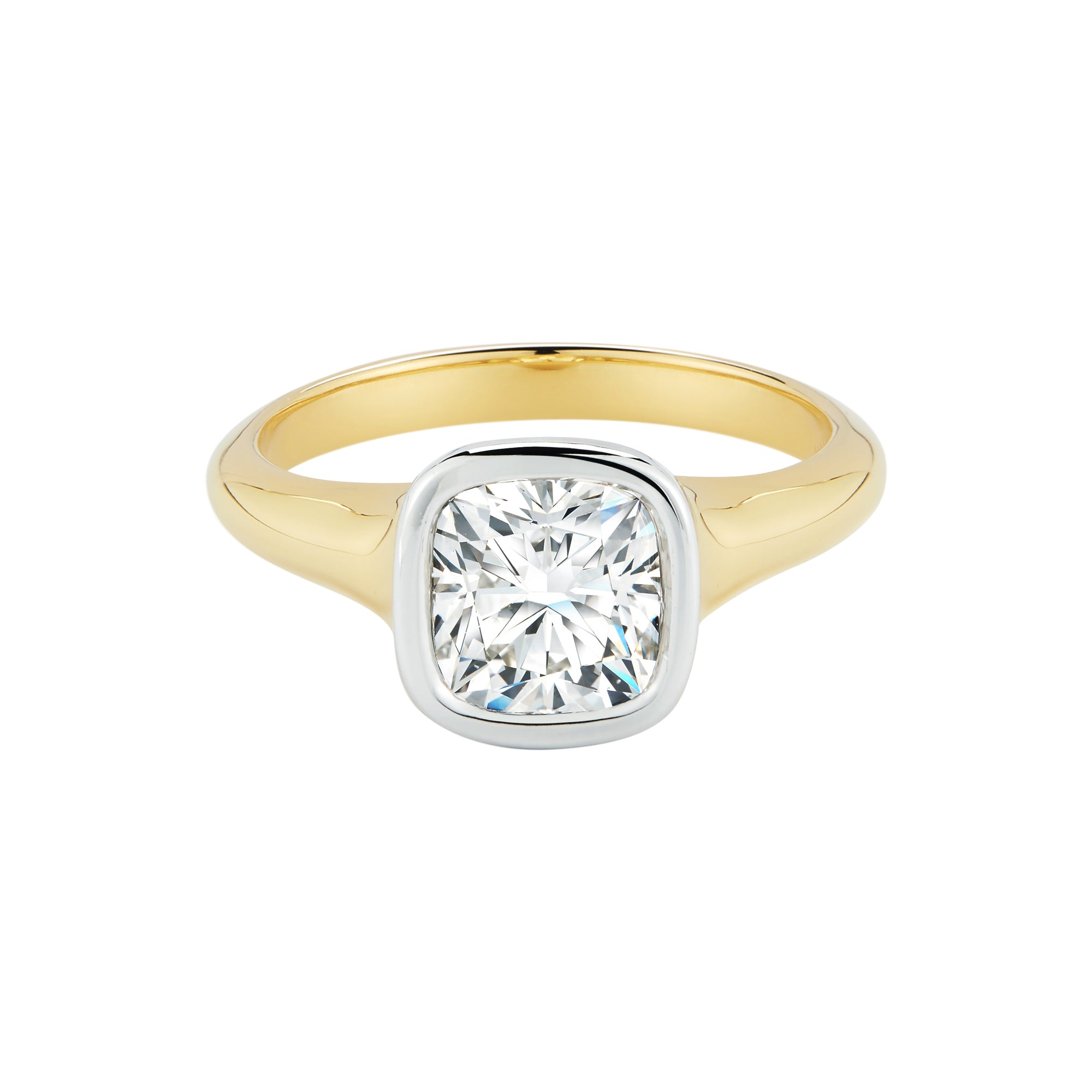 When you start with a spectacular diamond, the rest of the ring falls into place. Framed with a delicate platinum bezel to accentuate the stone's natural sparkle- the yellow gold band adds the perfect simple but sophisticated feel.