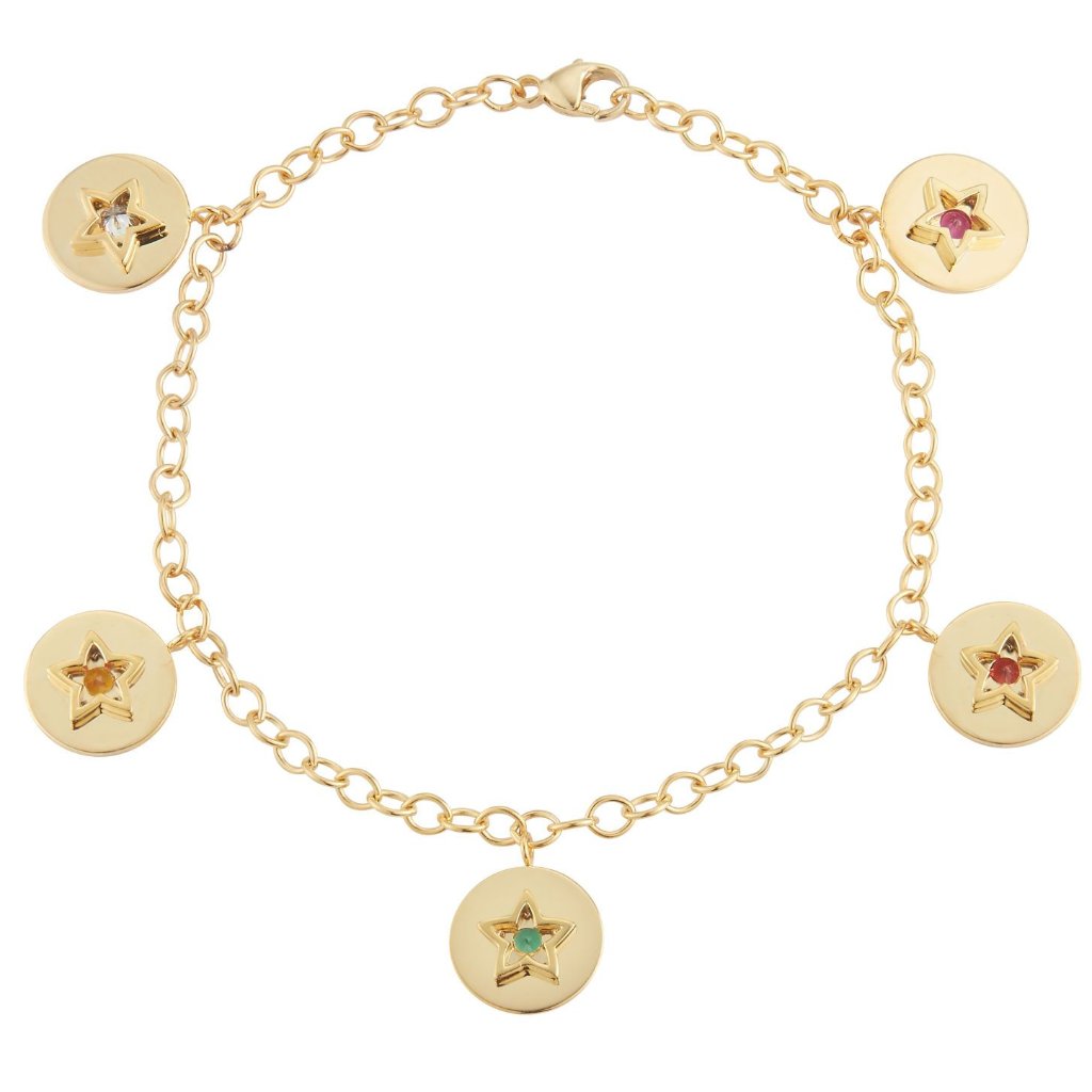 A colorful charm bracelet that flickers in fun. Each disc is set with a colored stone on the front, and a star motif on the back.
