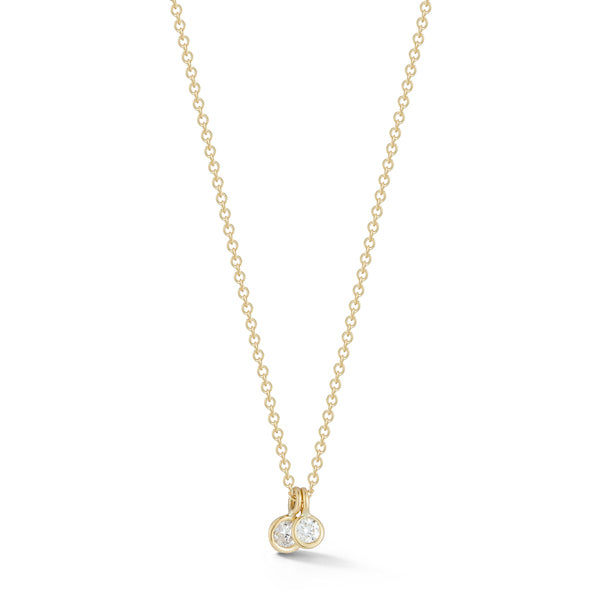 Two brilliant-cut diamonds in their eyeglass settings hanging from a delicate chain.