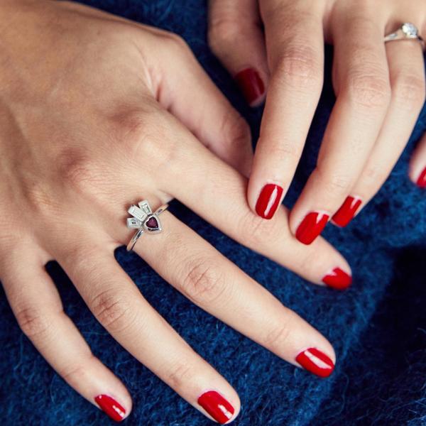 Inspired by Mexican Milagros, this Art Deco take on the sacred heart is a beautiful ring. A red ruby heart with baguette diamond flames.