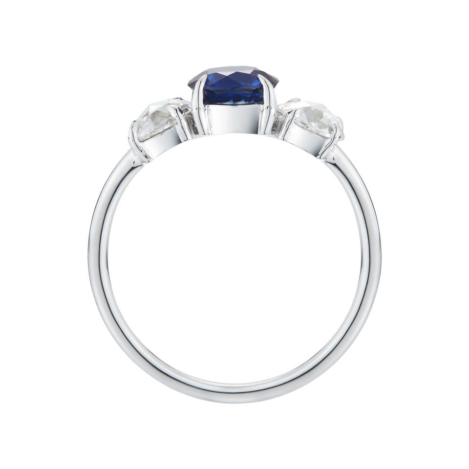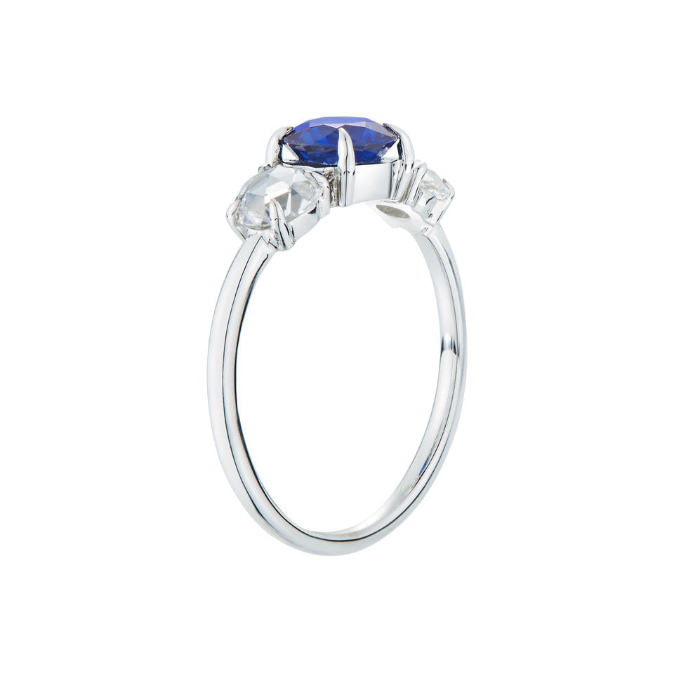This sapphire and rose cut diamond engagement ring is perfect for the woman who isn't afraid of colorful stones. The 18k white band is dainty but substantial enough to support three stones, one deep blue .90 carat sapphire flanked by two .28 ct rose cut diamonds.