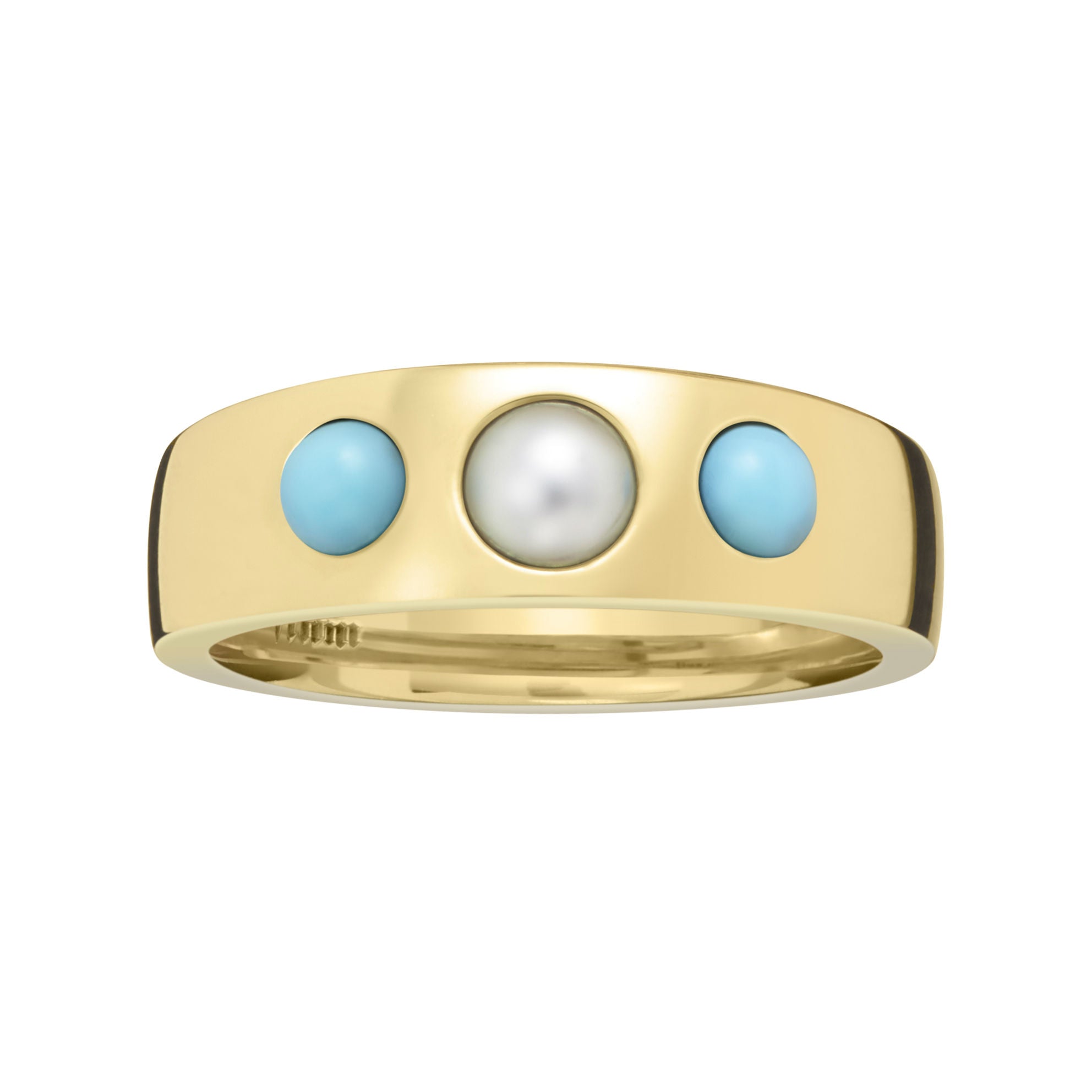 This gold pinky ring is set with a pearl and two natural turquoise cabochons in a gypsy setting.